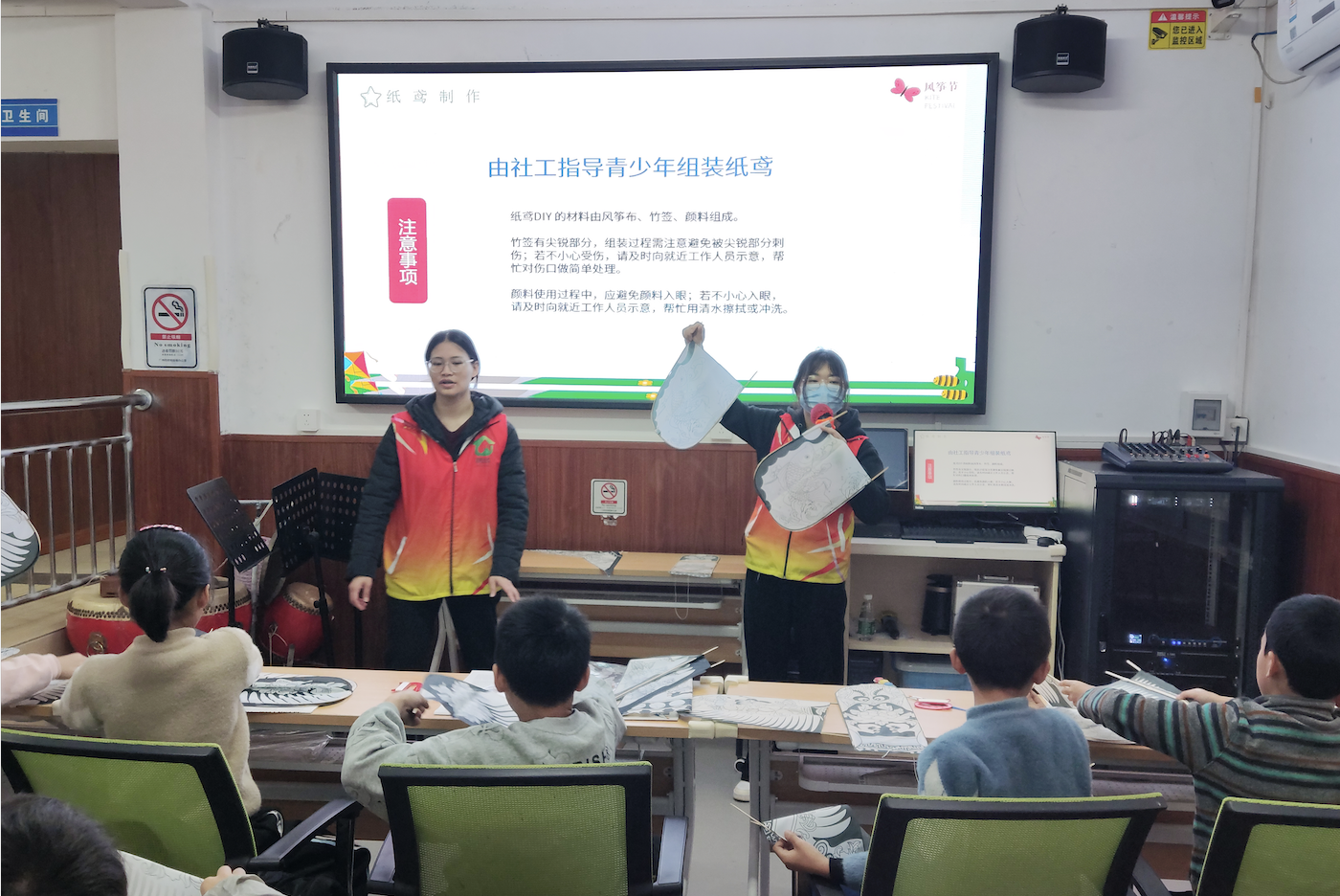 活动伊始,社工们以生动的讲解引领青少年们走进纸鸢的世界,从纸鸢的古老传说到现代潍坊风筝的非物质文化遗产地位,再到纸鸢在推动地方经济发展和旅游事业中的独特作用,让青少年们深刻感受到纸鸢在中国传统文化中的智慧与魅力。