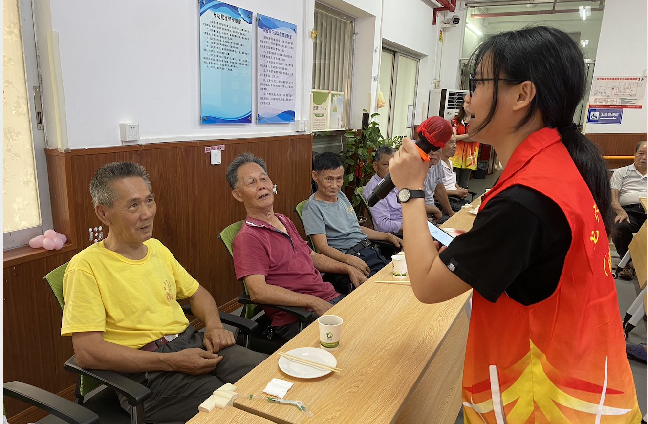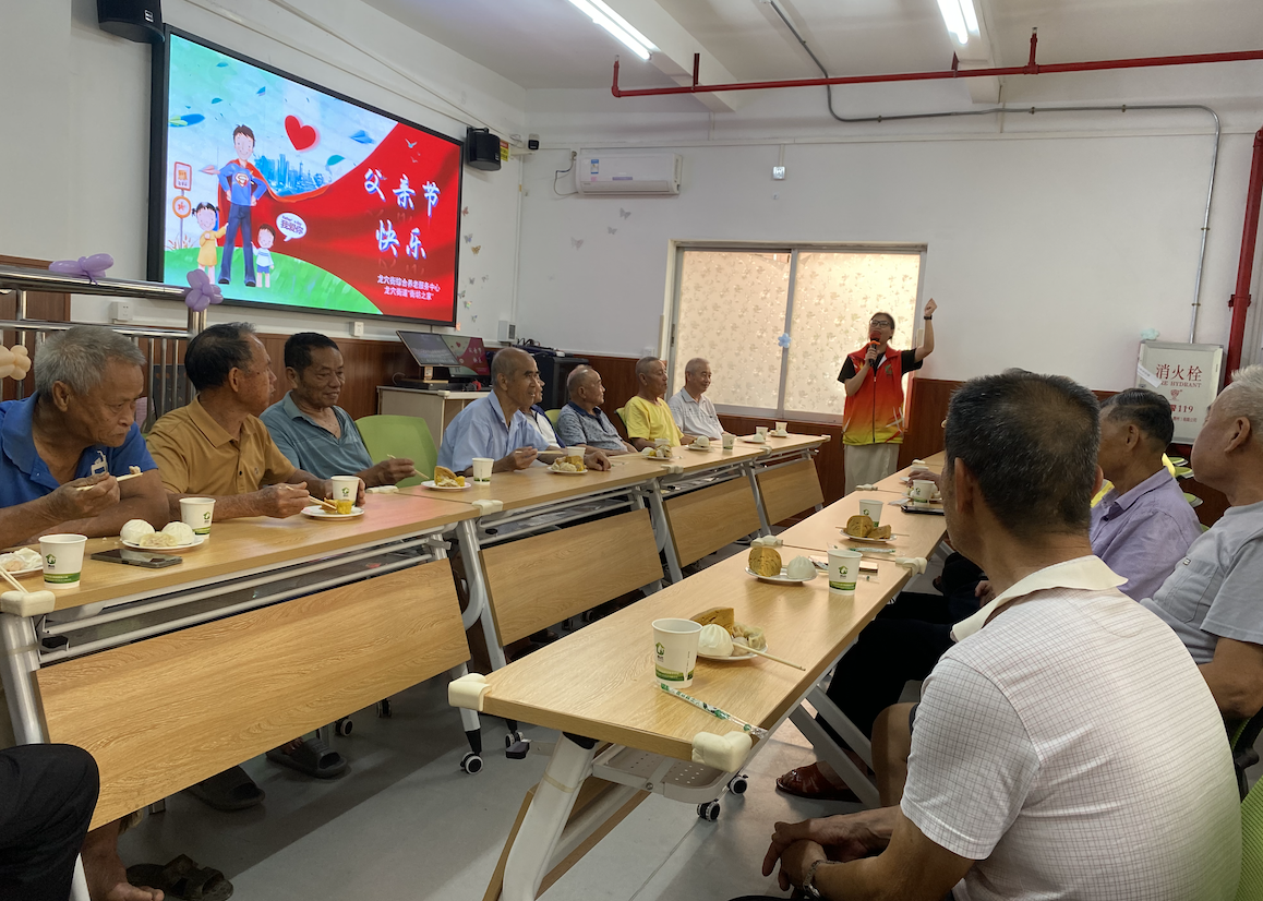 “这虾饺还可以喔,皮薄馅嫩,口感鲜美”、“马拉糕很松软,不会太甜,刚刚好”。社区中的父亲们围坐在桌旁,一边品尝美味广式风味,一边饮茶畅谈,聊一聊家长里短,谈一谈民生小事,现场氛围温馨且愉悦。